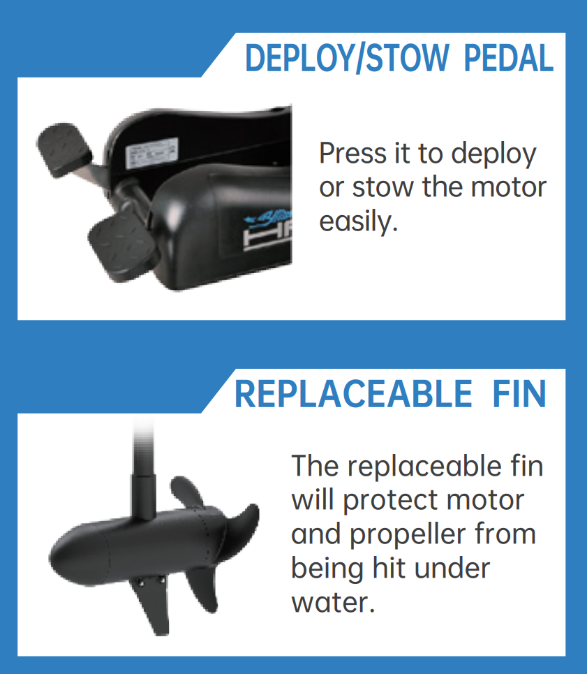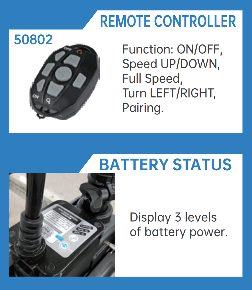 All models are equipped with LED battery status lights. A wireless foot controller and a quick release bracket are optional. The Cayman B is suitable for both salt water and fresh water use.