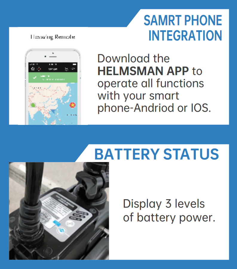 Additionally, the machine can be connected to smart phones through specially developed software. HELMSMAN APP offers functions such as electronic anchor, GPS intelligent navigation system, heading lock, route recording replay and cruise control.